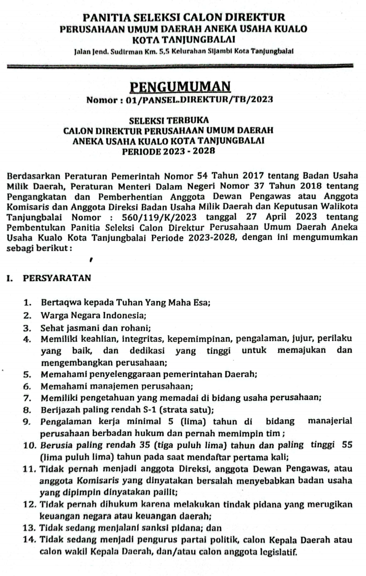 Berdasarkan Peraturan Pemerintah Nomor 54 Tahun 2017 tentang Badan Usaha Milik Daerah, Peraturan Menteri Dalam Negeri Nomor 37 Tahun 2018 Tentang Pengangkatan dan Pemberhentian Anggota Dewan Pengawas atau Anggota Komisaris dan Anggota Direksi Badan Usaha Milik Daerah dan Keputusan Walikota Tanjungbalai Nomor : 560/119/K/2023 Tanggal 27 April 2023 Tentang Pembentukan Panitia Seleksi Calon Direktur Perusahaan Umum Daerah Aneka Usaha Kualo Kota Tanjungbalai Periode 2023-2028, dengan ini mengumumkan sebagi berikut :