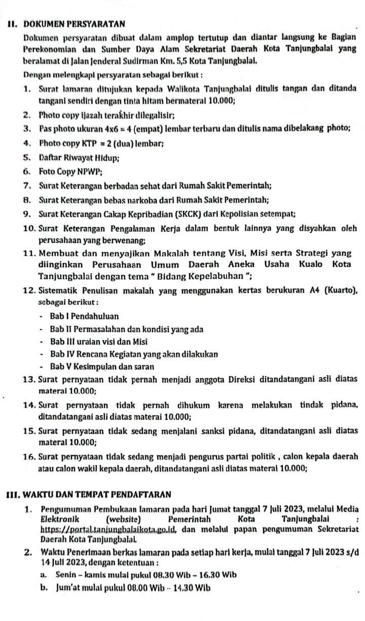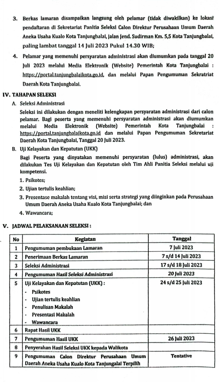 SELEKSI TERBUKA CALON DIREKTUR PERUSAHAAN UMUM DAERAH ANEKA USAHA KUALO KOTA TANJUNGBALAI PERIODE 2023-2028