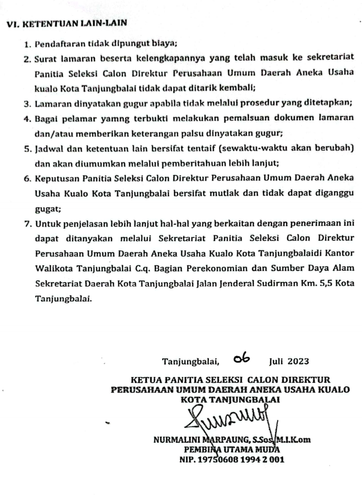 7. Untuk penjelasan lebih lanjut hal-hal yang berkaitan dengan penerimaan ini dapat ditanyakan melalui Sekretariat Panitia Seleksi Calon Direktur Perusahaan Umum Daerah Aneka Usaha Kualo Kota Tanjungbalai di Kantor