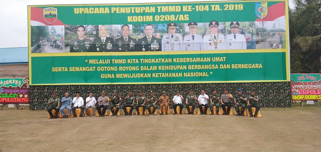 Kasdam 1/BB Brigjen TNI Hassanudin dalam sambutannya membacakan Sambutan tertulis Kepala Staf Angkatan Darat (Kasad), Jenderal TNI Andika Perkasa selaku penanggung jawab operasional TMMD tahun 2019 mengatakan, upacara penutupan ini sekaligus menandai berakhirnya program TMMD ke-104 yang dilaksanakan serentak di 50 kabupaten/kota di seluruh Nusantara.