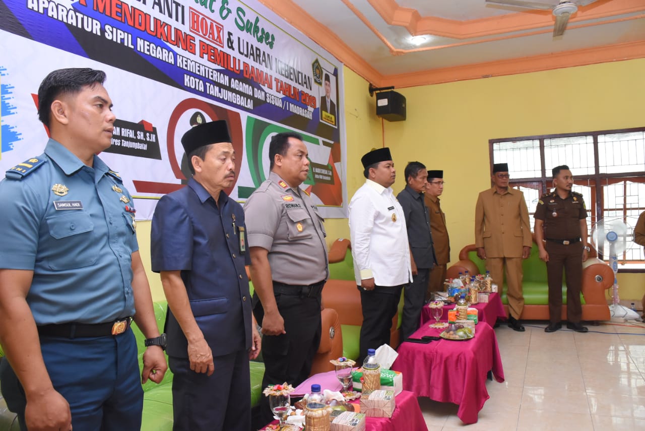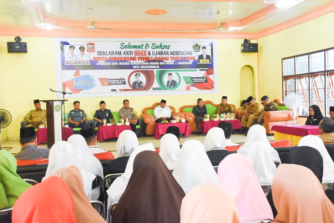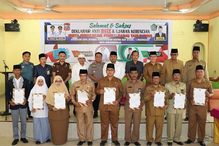 Wali Kota Tanjungbalai, H.M Syahrial SH,MH mengapresiasi Deklarasi Anti Hoax dan Ujaran Kebencian yang digelar oleh Kementerian Agama (Kemenag) Tanjungbalai dengan melibatkan Para Aparatur Sipil Negara (ASN) Kemenag Tanjungbalai dan Para Siswa-siswi Madrasah Se Kota Tanjungbalai yang diselenggarakan di Aula MUI Tanjungbalai, Jalan Gaharu II, Kelurahan sirantau, Kecamatan Datuk Bandar (Senin, 25/2/2019).
