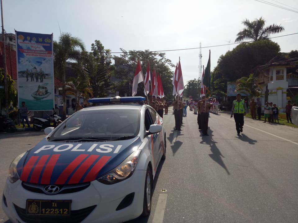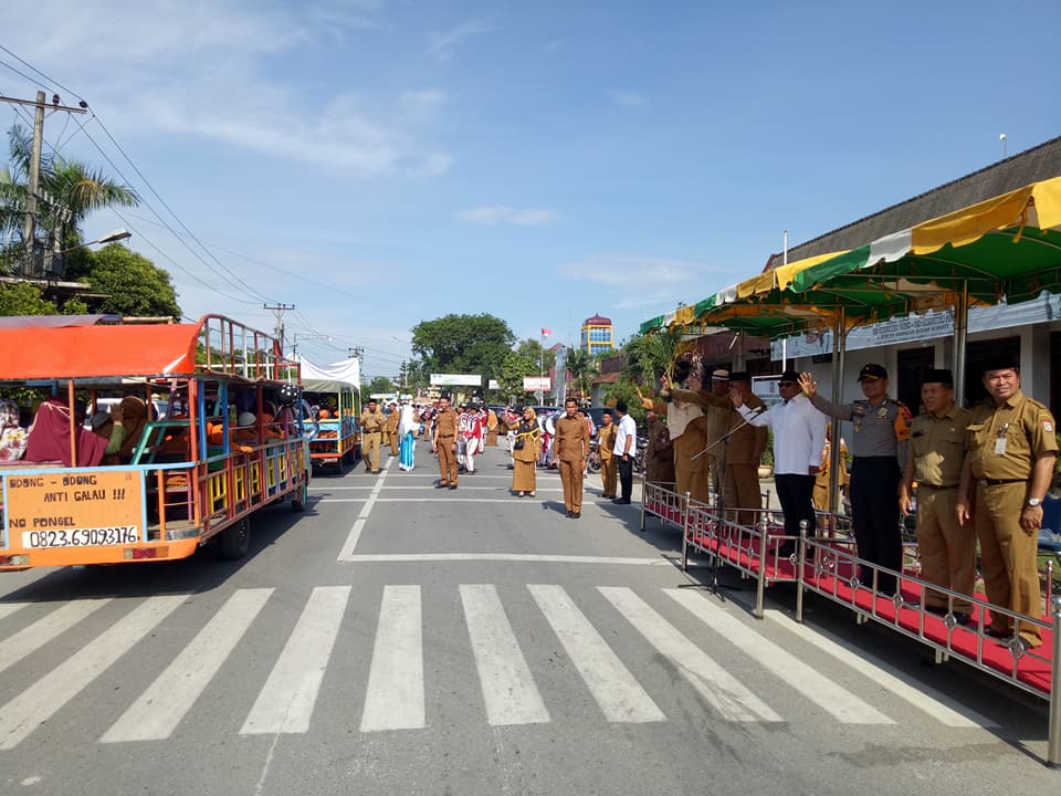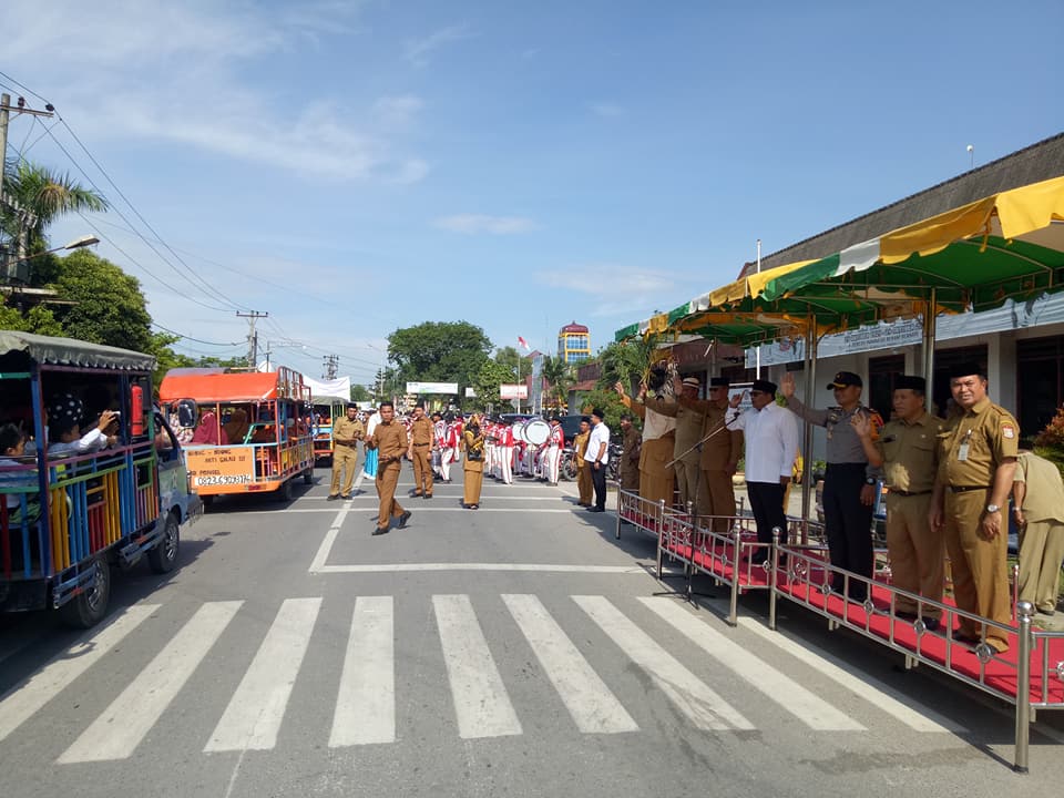 Wali Kota Tanjungbalai H.M Syahrial SH,MH hadir langsung di mimbar kehormatan menerima peserta pawai dalam rangka Hari Ulang Tahun (HUT) Yayasan Madrasah Pendidikan Islam (YMPI) Kota Tanjungbalai Ke-70 Tahun di jalan sudirman, depan rumah dinas Wali Kota (Senin, 14/5/2018).