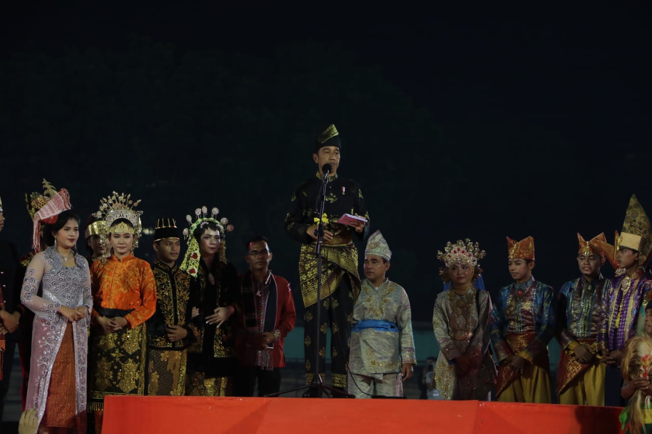 Sesuai dengan tema acara, Jokowi mengenakan baju adat Melayu perpaduan warna hitam dan emas. Sementara Ibu Negara Iriana mengenakan Kebaya Ungu dan Kain Ulos.