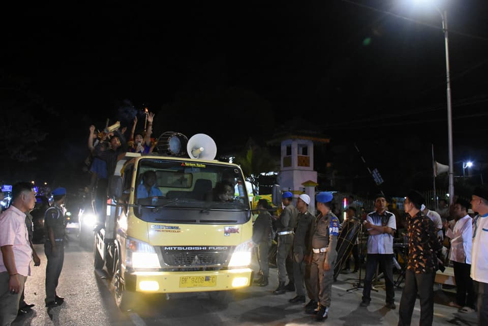 Wali Kota Tanjungbalai H.M Syahrial SH,MH, didampingi Wakil Wali Kota Drs.H Ismail dan seluruh unsur Forum Koordinasi Pimpinan Daerah Kota Tanjungbalai melepas secara resmi peserta pawai takbir Idul Fitri di depan rumah dinas Wali Kota Jalan Sudirman, Kamis Malam (14/6/2018).