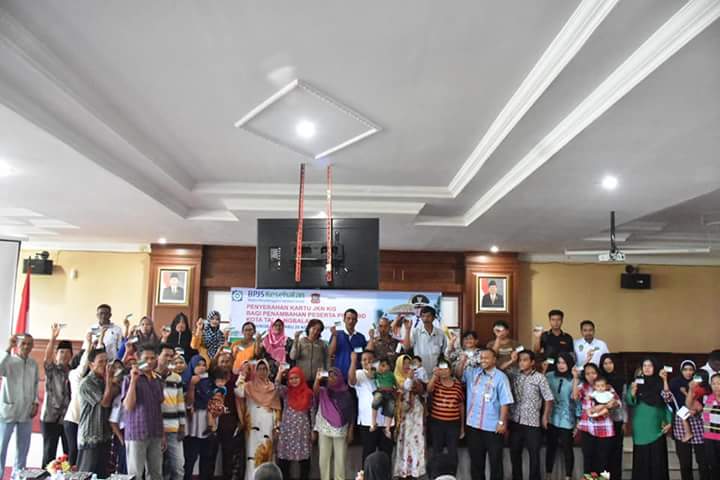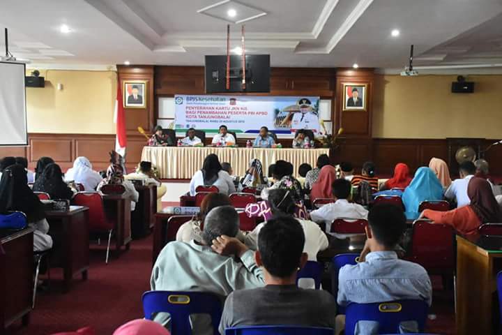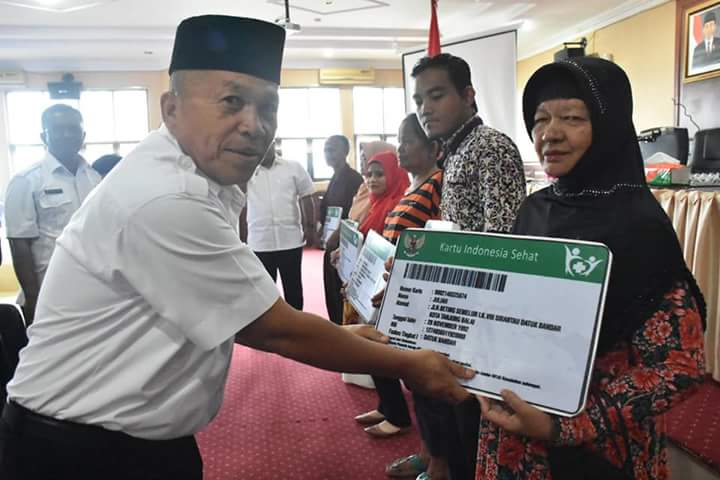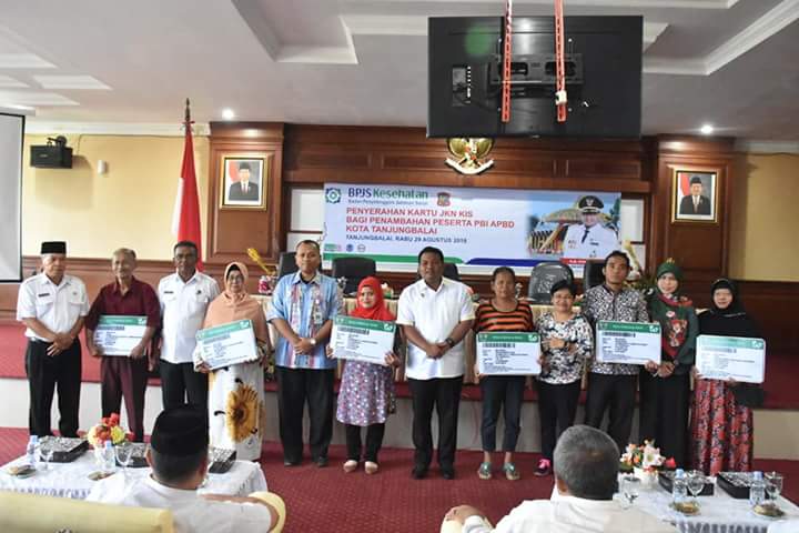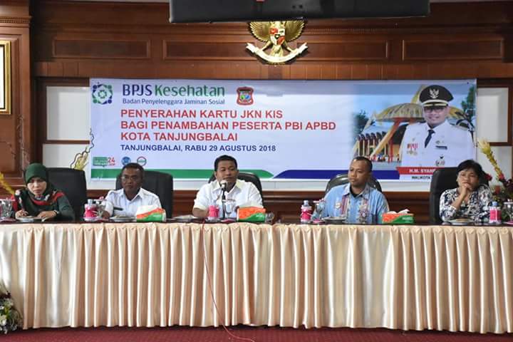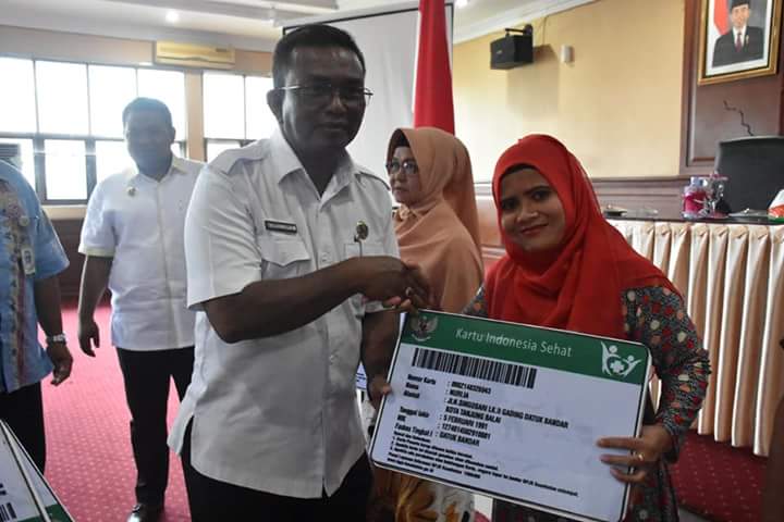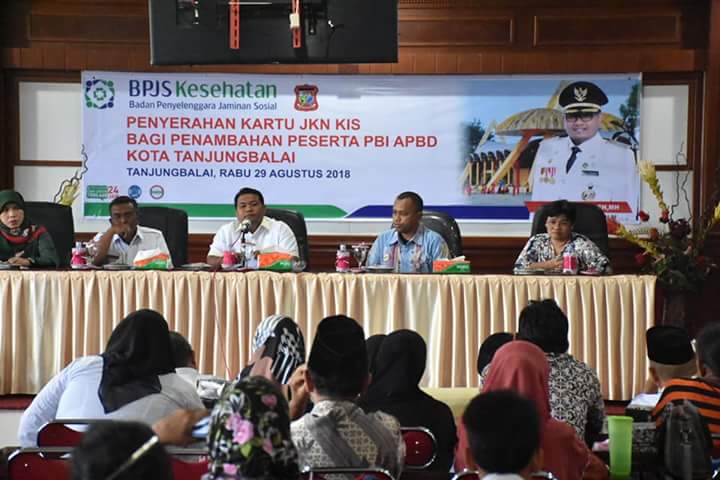 Wali Kota Tanjungbalai, H.M Syahrial SH,MH secara simbolis menyerahkan kartu JKN-KIS PBI APBD Kepada Warga Penerima Manfaat yang dipusatkan di Aula I Kantor Wali Kota (Rabu, 29/8/2018).