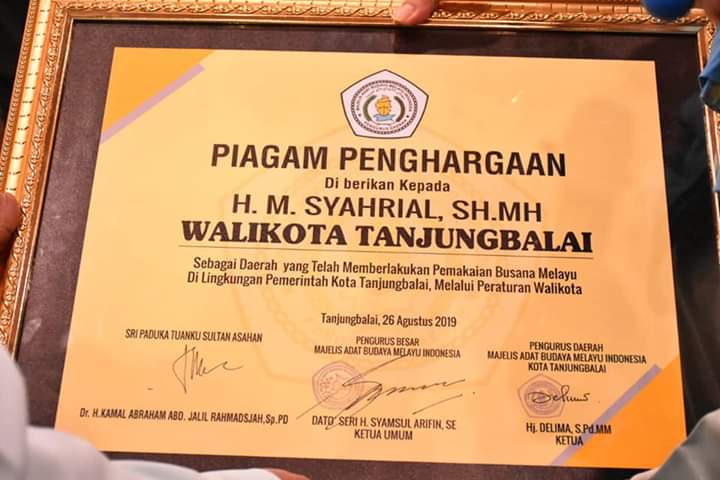 Wali Kota Tanjungbalai H.M Syahrial SH,MH menerima Piagam Penghargaan sebagai Kepala Daerah Peduli Budaya Melayu yakni “Sebagai Daerah yang telah memberlakukan Pemakaian Busana Melayu dilingkungan Pemerintah Kota (Pemkot) Tanjungbalai melalui Peraturan Wali Kota”. Penghargaan diberikan langsung oleh Ketua Umum PB MABMI Datok Sri H Syamsul Arifin, SE gelar Datuk Sri Lelawangsa dan Sri Paduka Tuanku Sultan Asahan Dr Kamal Abraham Abdul Jalil Rahmadsyah kepada Wali Kota Tanjungbalai H.M Syahrial SH,MH saat menghadiri Pelantikan Pengurus Daerah Majelis Adat Budaya Melayu Indonesia (PD MABMI) Kota Tanjungbalai, Sumatera Utara, Periode Tahun 2019 -2023 yang dilaksanakan di Ball Room Grand Singgie Hotel, Jalan HOS Cokroaminoto, Tanjungbalai, Senin (26/8/2019) Sore.